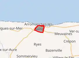 Arromanches-les-Bains is 12 km north-east of Bayeux and 10 km west of Courseulles-sur-Mer on the coast where the Normandy landings took place on D-Day, 6 June 1944. Access to the commune is by the D514 road from Tracy-sur-Mer in the west passing through the town and continuing to Saint-Côme-de-Fresné in the east. The D87 road also goes from the town south to Ryes. The D65 road goes east to Meuvaines. About a third of the commune is the urban area of the town with the rest farmland.[4]