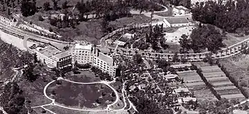 The Arrowhead Springs Hotel opened in 1939 as a resort hotel in San Bernardino Mountains. It became a popular spot for Hollywood guests. Above the resort on a near by hill is an arrowhead-shaped natural landmark, thus the name. The report was designed by African American architect Paul R. Williams and Gordon Kaufmann in the art deco style. The land was home to the Yuhaaviatam clan of the Serrano people before the resort opened. The before the resort the spot was a small tuberculosis sanitarium center that had a natural steam cave and mud baths that opened in 1864. A 1886 fire bunt down the sanitarium building. A new hotel was built in 1905 and at the same time, the Arrowhead Springs Company was founded selling bottled spring water, Arrowhead Springs water. In 1938 the resort was sold to Hollywood group: Jay Paley, Joseph M. Schenck, Constance Bennett, Al Jolson, Darryl Zanuck and Claudette Colbert for $800,000. A 1938 fire burnt down this second resort. The group spent $1.5 million and built the current resort. The main building is four-story with two wings the center also had 10 bungalows. The interior was designed by Dorothy Draper of New York. Hollywood guests included Charlie Chaplin, Judy Garland, and Clark Gable. Bugsy Siegel was a regular guest also. The resort was used for filming movies, including Humphrey Bogart in High Sierra in 1941. The US Navy leased the resort hotel on 7.5-acre and turned it into a 149 room hospital that opened in June of 1944, also called Naval Special Hospital, Arrowhead Springs. It was opened to help with the overcrowing at US Naval Hospital Corona. In June 1944, 500 patients were transferred from Corona to Arrowhead Springs. At the end of the war, in November 1945, when the Hospital closed over 5800 troops had been cared for at the Hospital. After the war it returned to a resort hotel. Esther Williams made a movie, Thrill of a Romance in 1945. In 1946, the resort was purchased the Hull group of Chicago. Then in 1946, sold to Conrad Hilton for $2 million. In 1950 Elizabeth Taylor and Nicky Hilton honeymooned at the resort. Sold again in 1951 to Hilton Hotel, then to Campus Crusade for Christ in 1961. Campus Crusade for Christ moved to Orlando, Florida in 1991. In March of 1992, the resort went for sale with no buyers. The resort was vacant till sold to San Manuel in 2017.[2][3][4]