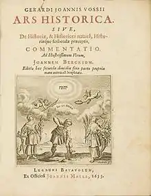 In the century that followed, interest in the rhetoric of the genre continued, though its intellectual content was exhausted. The literary focus of Agostino Mascardi's Dell’arte historica reflects the intellectual demotion of the magistra vitae concepts with the advent of Cartesian and scientific rationalism.[2] Gerardus Vossius published a work in 1623 by this title that had subsequent editions, including the one pictured above from 1653. Degory Wheare's Oxford contribution, De ratione et methodo legendi historias, also appeared in 1623.