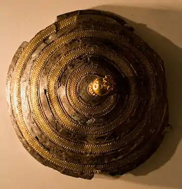 A few decorative bronze Urartian shields have been found near Van (they are stored in the British Museum and Berlin museums) and 14 were excavated at Karmir Blur. They have diameters ranging between 70 and 100 cm and were not made for combat, as judged from the thinness of the metal and the character of the handles. All these shields contain concentric circles of lions and bulls which were designed so that no figure would appear upside down. The images were first stamped and then engraved with various instruments. The Assyrian king Sargon II described six golden Urartian shields, which were looted in Musasir, weighing 6.5 kg each. They have not been recovered thus far.