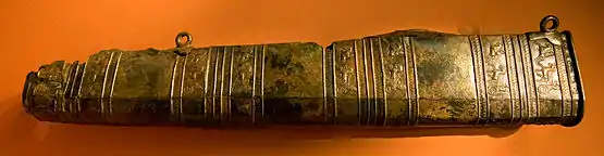 Poorly preserved remains of Urartian mail of Argishti I were excavated at Teishebaini.[14] Entire (or parts of) wide bronze belts were found in Turkey (Altıntepe), Iran (Lake Urmia) and Armenia (Karmir Blur). The belts were about 1 meter long and 12 cm wide and were designed to protect archers.