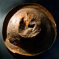 | Shield of Sarduri II. Cuneiform inscription on the edge reads: "Sarduri, son of Argishti dedicates this helmet to God Ḫaldi."[12] | Shield of Argishti I. Cuneiform inscription on the edge reads: "Argishti, son of Menua, dedicates this helmet to God Ḫaldi."[13] | ||