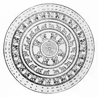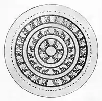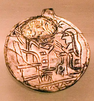 Jewelry of Urartu had two gradations: ornaments made of precious metals and stones for the king and his family, and their simplified bronze versions used by the rich. Many jewelry items were also used as amulets.[15] Annals of the Assyrian king Sargon II mention vast amounts of Urartian jewelry items made of silver and gold which were taken from Musasir in 714 BC.[1] They are not preserved and some may have been melted by treasure hunters.[3] The two largest recovered jewelry items are shown below. They are the pectoral decoration excavated at the late Urartian capital Rusahinili and the cover of the cauldron found at Teishebaini. Smaller items include golden pins, earrings, a bracelet and a few medallions. Jewelry was worn in Urartu by both men and women. Women's jewelry usually portrayed the Urartian goddess Arubani, wife of Ḫaldi – the supreme god of Urartu. Also common are Mesopotamian motifs such as tree of life and winged sun. More accessible jewelry included bronze bracelets and earrings and carnelian beads.[15]