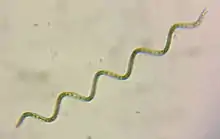 The helical parameters of the shape of Arthrospira is used to differentiate between and even within the same species.[8][9] These differences may be induced by changing environmental conditions, such as temperature.[10] The helical shape of the trichomes is only maintained in a liquid environment.[11] The filaments are solitary and reproduce by binary fission, and the cells of the trichomes vary in length from 2 to 12 μm and can sometimes reach 16 μm.