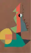 Dove exhibited his works at Stieglitz's 291 gallery in 1910 as part of the show "Younger American Painters", which also included Dove's old friend Maurer.[6] Dove showed one painting, a large still life painted in France entitled “The Lobster”, which would be his last representational work.[6] Stieglitz provided Dove with his first one-man show in 1912 at the 291.[1] The show, which included a group of Dove's pastels that came to be known as "The Ten Commandments", was the first public exhibition of abstract art by an American.[6] In the two years after meeting Stieglitz, Dove became a leader in international art developments.[6] From 1912 to 1946 Dove showed his work annually at Stieglitz's galleries: 291, Intimate Gallery, and An American Place.[6] Dove used a wide range of media over the course of his career, sometimes in unconventional combinations. During the 1920s Dove made many works on paper such as the pastel on paper, Nature Symbolized (or Reefs) from 1924. As stated above Dove did experimental collage works in the 1920s in works like The Critic, 1925, and The Intellectual 1925;[11][12] and he experimented with techniques, combining paints like oil and/or tempera over a wax emulsion. Tanks, 1938 is an example of oil over a wax emulsion; commenting about Tanks, the Boston Museum of Fine Arts says: Set off by a halo of pale gray, the quivering structures almost seem to dematerialize and merge into the surrounding scenery, yet at the same time, they retain their hulking forms.[5]