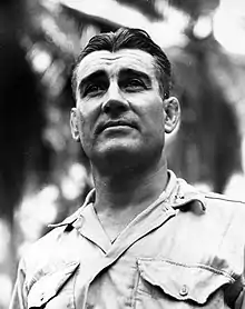 The 21st Marines finally went ashore on November 6 and spent next few weeks of light fighting with no major action against Japanese forces. During the second week in December of that year, Butler took part in the Battle of Hellzapoppin Ridge and Hill 600A, where the regiment's primary task was to reduce these positions and drive the remaining Japanese east of the Torokina River. The thick jungle and narrow trails added to the Marines' difficulties as they attempted ro dislodge the enemy. The battle lasted until December 24 and Butler and his regiment finally embarked for Guadalcanal on January 9, 1944. For his service on Bougainville, Butler was decorated with the Legion of Merit with Combat "V".[5][3]
