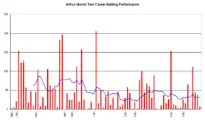 According to Bradman, Morris' success was due to his powerful wrists and forearms. Bradman interpreted Morris' unorthodox methods—he often defended with his bat not straight—as a sign of genius.[130] Ian Johnson believed that Morris' idiosyncratic technique was a strength, as it disrupted any plans made by the opposition.[38] Contrary to the accepted wisdom of the day, Morris had a penchant for lofting his drives, backing his ability to clear the infield.[38] Benaud rated Morris alongside Neil Harvey as having the best footwork against spin bowling among batsmen after the Second World War.[135] Morris was particularly known for his fast analysis of the length of the ball, and as a result, he quickly and decisively moved forward or back.[38] Morris' productivity declined in the latter half of his career, something he put down to the break-up of his opening pairing with Barnes. Morris' partnerships with his later partners yielded less runs, leading him to remark that "When Siddy [Barnes] went, I lost a lot of support because he'd always get ones."[136] Morris was also known for his unselfishness, often sacrificing his wicket after being involved in mix-ups while running between wickets, and he had a reputation for not attempting to finish not out to inflate his average.[76]