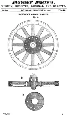 Wheels with wood spokes fitted together in a keystone fashion with miter joints, bolted into a two-piece metal nave, were called "wedge wheels" by Walter Hancock who described them in 1834, as he used them on his steam-powered road vehicles.[1] In response to Hancock's description, John Robison said he had wheels of the same description built in 1811 for artillery carriages, and that "A construction very analogous to this has long been in use in the Madras Artillery; in which service I have always understood that it gave every satisfaction."[2]