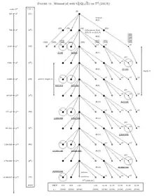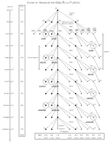 In contrast, let us secondly select the sporadic part of the coclass graph for demonstrating that another way of attaching additional arithmetical structure to descendant trees is to display the counter of hits of a realized vertex by the second -class group of fields with absolute discriminants below a given upper bound , for instance . With respect to the total counter of all complex quadratic fields with -class group of type and discriminant , this gives the relative frequency as an approximation to the asymptotic density of the population in Figure 12 and Table 3. Exactly four vertices of the finite sporadic part of are populated by second -class groups :