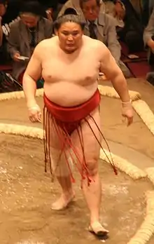 He acquired Japanese citizenship in April 2017. This allowed him to stay in the sumo world after retirement as an elder of the Japan Sumo Association.[1] He announced he was retiring on May 12, 2017. He became Nishikijima Oyakata, an elder name which had been thought to be owned by the active wrestler Toyonoshima, but Asasekiryū is listed in an owner's position rather than a borrower's at the Sumo Association. In his retirement press conference he said his most memorable honbasho was his 13–2 runner-up performance in March 2004, the same tournament in which his stablemate Asashōryū won with a perfect 15–0 record. His danpatsu-shiki (retirement ceremony) was held at the Ryōgoku Kokugikan on February 4, 2018, with around 250 guests taking part in the hair-cutting ritual.[2] His four-year-old son was scheduled to appear with him but began crying and was excused.