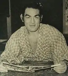 In September 1950 he reached the second highest jūryō division and won the championship with a 14–1 record. This earned him immediate promotion to the top makuuchi division in January 1951. He adopted the shikona or ring name of Asashio Tarō in 1952. In his early career he earned seven kinboshi or gold stars for defeating yokozuna, three of them coming in one tournament in January 1955 when he beat Yoshibayama on Day 5 and then Chiyonoyama and Tochinishiki on Days 8 and 9.[1] In January 1956 he changed the spelling of his ring name to 朝汐 太郎, but changed it back in July 1960.