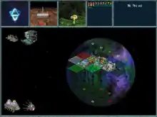 Planet topography is expressed as various colored squares. White squares are general purpose, where any structure can be built. Green squares increase the output of Prosperity-producing buildings, while red squares improve Industry and blue squares improve Research.[10] There are also black squares, which are initially uninhabitable but can be used later in the game as the player researches technology. Planets have ten orbital squares that can be used to build shipyards, planetary defenses, space ships, and other space structures.