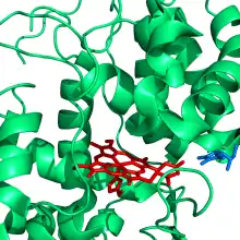 ![]() Structure of ascorbate peroxidase in complex with ascorbate (in blue); a histidine ligand (in red) coordinates to the iron of the heme group (also in red). Image taken from PDB 1OAF and created using Pymol | |||||||||