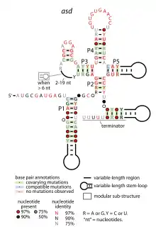 ![]() Consensus secondary structure of asd RNAs. The stem marked "terminator" is predicted as a Rho-independent transcription terminator. | |