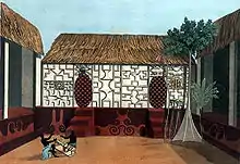 ...an immense building of a variety of oblong courts and regular squares [with] entablatures exuberantly adorned with bold fan and trellis work of Egyptian character. They have a suite of rooms over them, with small windows of wooden lattice, of intricate but regular carved work, and some have frames cased with thin gold. The squares have a large apartment on each side, open in front, with two supporting pillars, which break the view and give it all the appearance of the proscenium or front of the stage of the older Italian theaters. They are lofty and regular, and the cornices of a very bold cane-work in alto-relievo. A drop-curtain of curiously plaited cane is suspended in front, and in each, we observed chairs and stools embossed with gold, and beds of silk, with scattered regalia.[31]