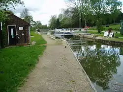 The Order allows Leicestershire County Council to purchase land and construct 2.5 miles (4 km) of canal from Snarestone to Measham. Initially, this would follow the original route, but would diverge near Measham, to use the track of a redundant railway. The new canal would pass through Measham Station and cross the High Street on an aqueduct.[23] The Transport and Works Act Order was introduced by the British Parliament in 1992 as a way of simplifying the legal processes for railway and canal projects, and works which interfere with navigation rights.[24] Although a number of railway projects had previously been authorised under this legislation, the Ashby Canal Order obtained by Leicestershire County Council was the first time that construction of a canal had been authorised in this way.[25] Purchase of the land between Snarestone and Measham had been completed by 2010.[26] Re-construction of the first 100 yards (91 m) of the infilled section began on 26 February 2009, after a grant from the East Midlands Development Agency was secured. The £0.5 million project involved the provision of a stop lock, a new slipway, an improved winding hole and a wetland nature reserve, running parallel to the canal and connected to it.[27] The stop lock chamber marks the division between the part of the canal owned by the Canal & River Trust, and that owned by Leicestershire County Council,[28] although no gates have been fitted while the length of canal beyond the chamber is short.[29]