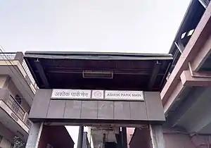 The Ashok Park Main Metro Station is a station on the Green Line of the Delhi Metro and is located in the West Delhi district of Delhi. It is an elevated station and was inaugurated on 2 April 2010. An extension of this branch going towards Kirti Nagar was opened on 27 August 2011. It is an interchange station for both Red Line towards Inderlok and Blue Line towards Kirti Nagar. [1][2]