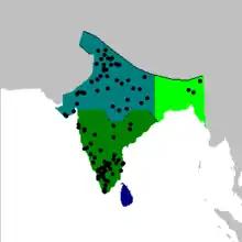 This passerine bird is found in dry open grassland, open woodland, scrub and in home gardens in many cities. The northern limits of the species are along the Himalayan foothills extending into the upper Indus river system. The species is absent from the dry desert zone of the west of India and extends east into Burma. The Sri Lankan population is found mainly in the lowlands but going up into the hills to about 1600 m.[4]