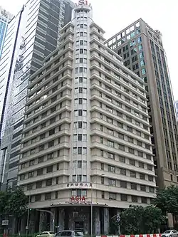 The Asia Insurance Building was designed in a luxurious Art Deco style, fulfilling Lee's intention to reflect the financial stability of the Asia Insurance Company. The building features an L-shaped plan with a circular concrete canopy and a two-storey corner tower on top of the building. The exterior of the building was lavishly adorned with expensive imported materials, signifying the economic prosperity of the company. The facade of the building was clad in premium Italian Travertine marble. The five-foot way around its perimeter is made from Nero Portaro marble, a rare type of black Italian marble with gold and whitish veins. The building also includes a brass mail chute, designed by James Cutler, where mail could be dropped at a high point and collected at a central depository.[20]