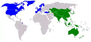 ADB has 68 members (as of 23 March 2019): 49 members from the Asian and Pacific Region, 19 members from Other Regions.[61] The year after a member's name indicates the year of membership. At the time a country ceases to be a member, the Bank shall arrange for the repurchase of such country's shares by the Bank as a part of the settlement of accounts with such country in accordance with the provisions of paragraphs 3 and 4 of Article 43.[62]