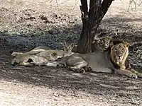Asiatic lions mate foremost between October and November.[67] Mating lasts three to six days. During these days, they usually do not hunt, but only drink water. Gestation lasts about 110 days. Litters comprise one to four cubs.[68] The average interval between births is 24 months, unless cubs die due to infanticide by adult males or because of diseases and injuries. Cubs become independent at the age of about two years. Subadult males leave their natal pride latest at the age of three years and become nomads until they establish their own territory.[58] Dominant males mate more frequently than their coalition partners. During a study carried out between December 2012 and December 2016, three females were observed switching mating partners in favour of the dominant male.[63] Monitoring of more than 70 mating events showed that females mated with males of several rivaling prides that shared their home ranges, and that these males were tolerant toward the same cubs. Only new males that entered the female territories killed unfamiliar cubs. Young females mated foremost with males within their home ranges. Older females selected males at the periphery of their home ranges.[69]