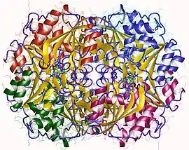 Asparaginase is an enzyme that is used as a medication and in food manufacturing.[3][4] As a medication, L-asparaginase is used to treat acute lymphoblastic leukemia (ALL).[3] It is given by injection into a vein, muscle, or under the skin.[3] A pegylated version is also available.[5] In food manufacturing it is used to decrease acrylamide.[4]