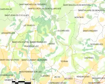 Located just north of Montpellier, Assas lies near Saint-Vincent de Barbeyrargues, Guzargues, Clapiers, Jacou, Castries and Teyran. The region near Assas is primarily scrubland, but it is watered by a number of streams and brooks and has a small wooded area that produces mushrooms in the fall.