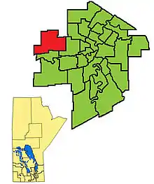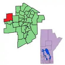 Assiniboia is a provincial electoral division in the Canadian province of Manitoba. It was first created for the 1879 provincial election, was eliminated in 1888, and was re-established in 1903. It is located in the westernmost tip of the City of Winnipeg.