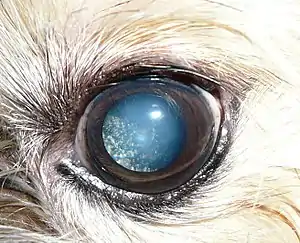 Asteroid hyalosis is a degenerative condition of the eye involving small white opacities in the vitreous humor. It is known to occur in humans, dogs, cats, horses, and chinchillas.[1] Clinically, these opacities are quite refractile, giving the appearance of stars (or asteroids) shining in the night sky—except that ocular asteroids are often quite mobile. Ocular asteroids must be distinguished from the more common typical vitreous floaters, which are usually fibrillar or cellular condensates. The cause of asteroid hyalosis is unknown, but it has been associated with diabetes mellitus,[2] hypertension, hypercholesterolemia,[3] and, in certain animals, tumors of the ciliary body.[4] In dogs, asteroid hyalosis is considered to be an age related change.[5] The asteroid bodies are made up of hydroxylapatite, which in turn consists of calcium and phosphates or phospholipids.[6] While asteroid hyalosis does not usually severely affect vision, the floating opacities can be quite annoying, and may interfere significantly with visualization and testing of the retina.[7] While treatment of asteroid hyalosis is usually unnecessary, vitrectomy may occasionally be indicated, for both diagnostic and therapeutic purposes.[8][9]