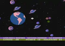 The view then cuts to space, where the player uses the joystick to cause the screen to rapidly scroll in the selected direction, creating the illusion of flight in the chosen direction. The screen is filled with planets and other objects. When the user presses the fire button on the joystick, the stick stops causing the ship to move, and instead fires its weapon in the chosen direction. The ship can simultaneously move and fire in different directions.