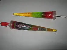 Astro Pops were first made in 1963 after two rocket scientists working on the space program in El Segundo, California decided to quit their jobs and create the Astro Pop, modeling the pop after a three-stage rocket.[1] They hand-built equipment, including machines to speed up the production of the cone wrappers. Astro Pops are unusual because the cone wrapper becomes the mold for the candy. Hot candy is poured directly into the wrapper, then a paper stick is added and the pop is capped off with a layer of wax.[1] Because Astro Pops were created in the 1960s, at the same time in history when the Space Race was in full force, millions of Astro Pops were sold when the manufacturers capitalized on this craze.[1]