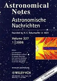 Astronomische Nachrichten (Astronomical Notes), one of the first international journals in the field of astronomy,[1] was founded in 1821 by the German astronomer Heinrich Christian Schumacher. It claims to be the oldest astronomical journal in the world that is still being published.[2] The publication today specializes in articles on solar physics, extragalactic astronomy, cosmology, geophysics, and instrumentation for these fields. All articles are subject to peer review.