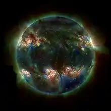 X-ray astronomy uses X-ray wavelengths. Typically, X-ray radiation is produced by synchrotron emission (the result of electrons orbiting magnetic field lines), thermal emission from thin gases above 107 (10 million) kelvins, and thermal emission from thick gases above 107 Kelvin.[47] Since X-rays are absorbed by the Earth's atmosphere, all X-ray observations must be performed from high-altitude balloons, rockets, or X-ray astronomy satellites. Notable X-ray sources include X-ray binaries, pulsars, supernova remnants, elliptical galaxies, clusters of galaxies, and active galactic nuclei.[47]