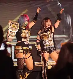 On the April 16, 2019, episode of SmackDown, Paige announced that she would be managing a newly formed women's tag team, consisting of Asuka and the debuting Kairi Sane from NXT.[298] The team of Asuka and Kairi Sane, later dubbed as "The Kabuki Warriors",[299][300][301] was immediately put in a feud with The IIconics (Billie Kay and Peyton Royce) over the WWE Women's Tag Team Championship. After weeks of avoiding them, The IIconics lost to The Kabuki Warriors during WWE's tour in Tokyo,[302] which earned The Kabuki Warriors a title match.[303] The title match took place on the July 16 episode of SmackDown, where The IIconics retained after they got themselves counted–out.[304] In August, The Kabuki Warriors failed to capture the titles from then–champions Alexa Bliss and Nikki Cross.[305][306]