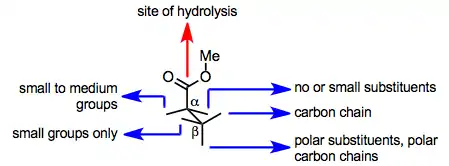 The active site of PLE facilitates both substrate binding and hydrolysis. A key serine residue in the active site promotes hydrolysis, but the substrate must present an ester group to this residue after binding to the enzyme active site for hydrolysis to take place. Whether the substrate is able to present an ester group to the catalytic serine residue depends on its bound conformation in the active site, which is dictated by amino acid side-chains in the active site. Thus, active site models of PLE have been advanced with the goal of predicting from the structure of the substrate which of two enantiotopic ester groups will be hydrolyzed (or whether hydrolysis is likely to occur at all).