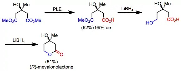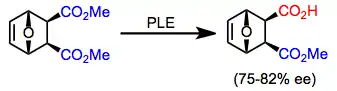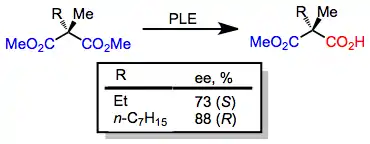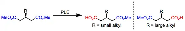 Pig liver esterase (PLE) is a widely used enzyme for asymmetric ester hydrolysis. Although it was originally used for the desymmetrizing hydrolysis of glutarate esters,[3] PLE also hydrolyzes malonates, cyclic diesters, monoesters, and other substrates. Active site models have been advanced to explain the selectivity of PLE.[4]