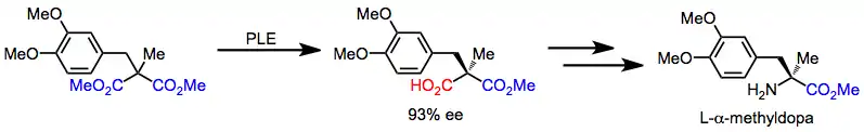L-α-Methyldopa may be rapidly synthesized from an achiral malonate through a sequence beginning with desymmetrization. Subsequent chemoselective transformations convert the carboxylic acid to an amine.[16]
