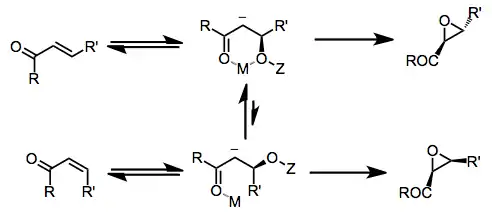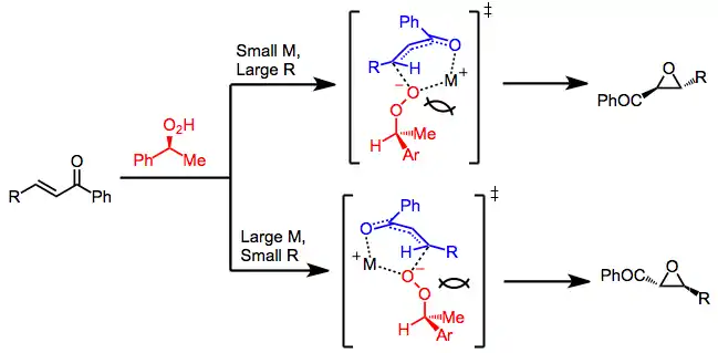 When chiral, non-racemic peroxides are used, the two transition states of epoxidation leading to enantiomeric products are diastereomeric. Steric interactions between the peroxide, enone, and templating cation M+ influence the sense of selectivity observed.[9]