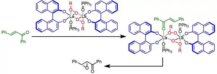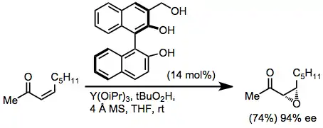 In combination with BINOL ligands and cumene hydroperoxide, lanthanide alkoxides can be used to epoxidize both trans and cis enones with high enantioselectivity. Studies of non-linear effects with these catalyst systems suggest that the active catalyst is oligomeric.[13]