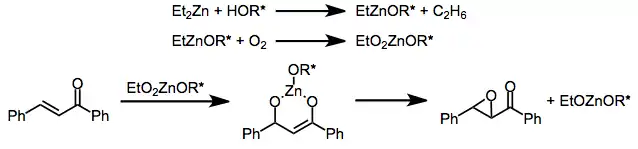 Methods that employ metal peroxides modified by chiral, non-racemic ligands operate by a similar mechanism in which the metal cation plays a templating role. Chiral zinc alkoxides under an oxygen atmosphere have been used to epoxidize some classes of enones (see equation (8) below). The evolution of ethane gas and uptake of oxygen are evidence for ligand exchange followed by oxidation of the intermediate zinc alkoxide species.[10] A catalytic version of this transformation has been achieved using chiral zinc alkylperoxides.[11]