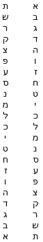 | Aleph | Bet | Gimel | Daleth | Heh | Vav | Zayin | Het | Tet | Yodh | Kaph | Lamed | Mem | Nun | Samech | Ayin | Peh | Tzady | Koof | Reish | Shin | Taw | |