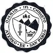The first is the official seal of the school. Ateneo de San Pablo's seal is different from the school seals of the other Ateneos which all have the shield of the family of St. Ignatius of Loyola.
