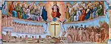 The video features Tangana and Peluso dancing in the cathedral grinding against each other,[10] as well as guest appearances by Brays Efe, Elizabeth Duval, Josep Pedrerol, Cayetana Guillén Cuervo and Miranda Makaroff, among others.[11][12] The last four are seen debating in a panel about some images of C. Tangana pulling Peluso's hair.[13] The cover art of the single is directly inspired by one of the mural paintings displayed in the cathedral's chapter house that features a woman held by her hair by a demon to prevent her salvation at the Last Judgment.[14]