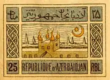 An illustration of the Baku Fire Temple was included on two denominations of Azerbaijan's first issue of postage stamps, released in 1919. Five oil derricks appear in the background.[58]