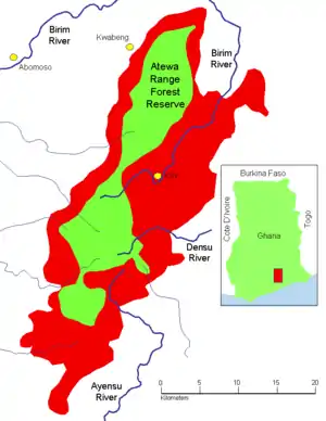 The Atewa range is the source of three important rivers: the Ayensu and Densu Rivers which flow south into the Atlantic, and the Birim which makes a long detour north and southwest around the Atewa range before joining the Pra River. The Birim, which flows through all the three of the traditional Akyem areas of Ghana, is an important but declining source of diamonds.[7]