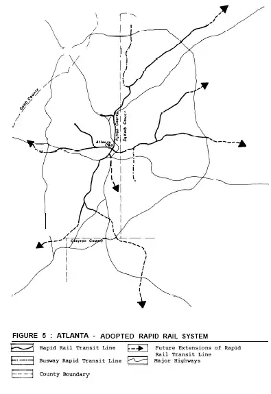 Atlanta has always been a rail town, and the city once had an extensive streetcar system, which also provided interurban service as far out as Marietta, 15 miles (24 km) to the northwest.[42][43] The streetcars were replaced by an extensive trolleybus system, supplemented by buses, in the 1940s and 1950–52, and then converted to all buses in the 1950s and 1960–62. However, building a modern rapid transit system proved a difficult and drawn-out process and, compared to the original plans for a regional system, has only partially been accomplished.[44]
