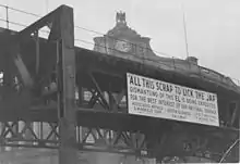 On December 6, 1919, the BERy began operating Dudley–South Station service, with trains running through the Washington Street Tunnel to North Station then over the Atlantic Avenue Elevated to South Station.[7][8] Additional North Station–South Station shuttles were added on January 17, 1920.[9] From 1920 to at least 1922, service from June to September was operated as Sullivan–Dudley to accommodate summer ferry ridership.[10][11][12] Beginning in September 1922, regular service ran Dudley–North Station.[12][13] On July 22, 1928, a northbound train derailed on the tight curve at Harrison and Beach due to excessive speed and crashed into the abandoned Beach Street station.[14] Two passengers were killed in the wreck – the first time that passengers were killed in an accident on the Main Line Elevated.[15] Regular service resumed on July 24.[16]
