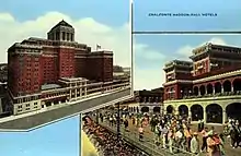 One by one, additional large hotels were constructed along the boardwalk, including the Brighton, Chelsea, Shelburne, Ambassador, Ritz Carlton, Mayflower, Madison House, and the Breakers. The Quaker-owned Chalfonte House, opened in 1868, and Haddon House, opened in 1869, flanked North Carolina Avenue at the beach end. Over the years, their original wood-frame structures would be enlarged, and even moved closer to the beach. The modern Chalfonte Hotel, eight stories tall, opened in 1904. The modern Haddon Hall was built in stages and was completed in 1929, at eleven stories. By this time, they were under the same ownership and merged into the Chalfonte-Haddon Hall Hotel, becoming the city's largest hotel with nearly 1,000 rooms. By 1930, the Claridge, the city's last large hotel before the casinos, opened its doors. The 400-room Claridge was built by a partnership that included renowned Philadelphia contractor John McShain. At 24 stories, it would become known as the "Skyscraper by the Sea." The city became known as "The World's Playground".[32][33]