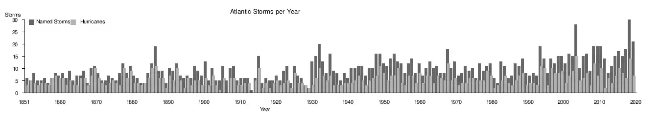Tropical disturbances that reach tropical storm intensity are named from a pre-determined list. On average, 10.1 named storms occur each season, with an average of 5.9 becoming hurricanes and 2.5 becoming major hurricanes (Category 3 or greater). The most active season on record was 2020, during which 30 named tropical cyclones formed. Despite this, the 2005 season had more hurricanes, developing a record of 15 such storms. The least active season was 1914, with only one known tropical cyclone developing during that year.[4] The Atlantic hurricane season is a time when most tropical cyclones are expected to develop across the northern Atlantic Ocean. It is currently defined as the time frame from June 1 through November 30, though in the past the season was defined as a shorter time frame. During the season, regular tropical weather outlooks are issued by the National Hurricane Center, and coordination between the Weather Prediction Center and National Hurricane Center occurs for systems which have not yet formed but may develop during the next three to seven days. There is also a season within a season. The strongest time for hurricane activity seems to be between mid-August through mid-October. Wind factors and temperature and moisture are perfect during this time to encourage cyclonic activity.[5]