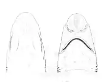 The Atlantic sawtail catshark reaches a maximum known length of 45 cm (18 in).[6] Slender and firm-bodied, it has a slightly flattened head with a moderately long, flattened snout.[7] The head is proportionately shorter and narrower, and the nostrils relatively farther from the snout tip, than in G. melastomus.[4][8] The nostrils are partially covered by triangular flaps of skin on their anterior rims. The eyes are horizontally oval and equipped with rudimentary nictitating membranes (protective third eyelids). There is a slight ridge below each eye, and a minute spiracle behind. The large mouth is wide and curved, with rather long furrows around the corners. The small teeth each have a narrow central cusp flanked by multiple smaller cusplets on either side. There are five pairs of gill slits.[7]